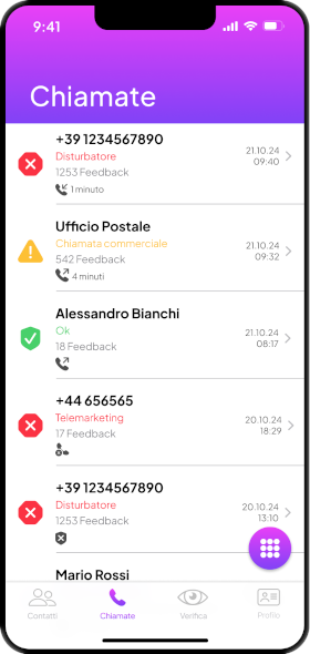 L'utilizzo di esiti con un codice colore prestabilito: verde, giallo e rosso oltre a salvaguardare la tua privacy ti permette di individuare immediatamente se la chiamata proviene da un disturbatore o meno.